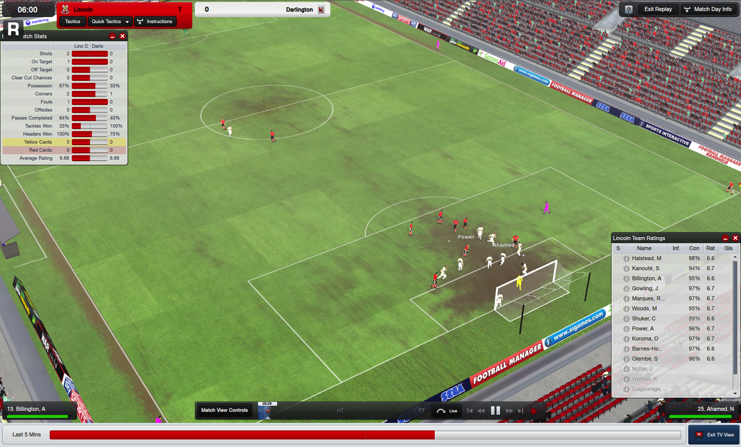 Young centre back Karlton Watson replaced Kanouté in the 67th minute, with Gowling moving across to right back. Then Power went down injured in the 76th minute. I picked John Nutter as his replacement, since I wanted the club captain on the pitch at the final whistle. Olembé took on an unfamiliar central midfield role to accommodate Nutter.